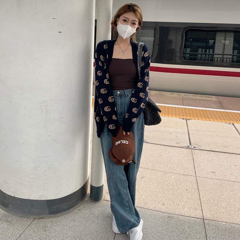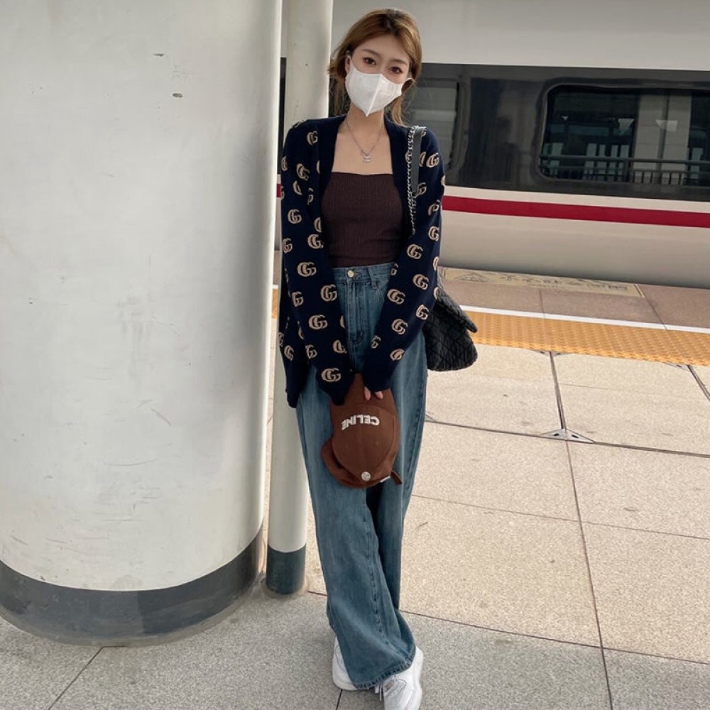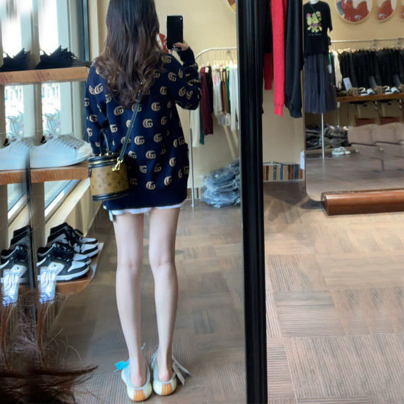 【製品名】レディース向けグッチカーディガン上品 潮流 長袖ニットセーター高品質 お洒落ブルーブラック前開き上着Gucci 刺繍ロゴカジュアルセーター